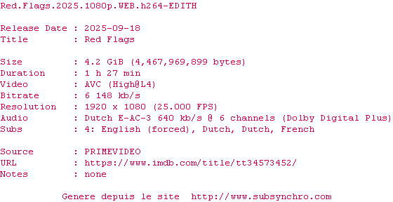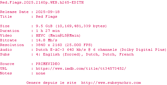 Voir le nfo de la release Red.Flags.2025.SUBFRENCH.2160p.WEB.H265-LUCKY