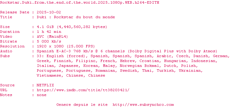 | Voir le nfo de la release Rockstar.Duki.From.The.End.Of.The.World.2025.1080p.WEB.H264-EDITH | EDITH | Rockstar.Duki.From.The.End.Of.The.World.2025.1080p.WEB.H264-EDITH OpenSubtitles | 0 fichier |