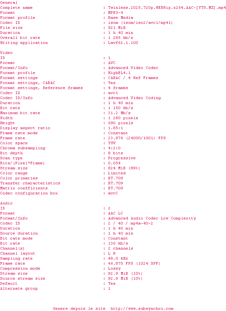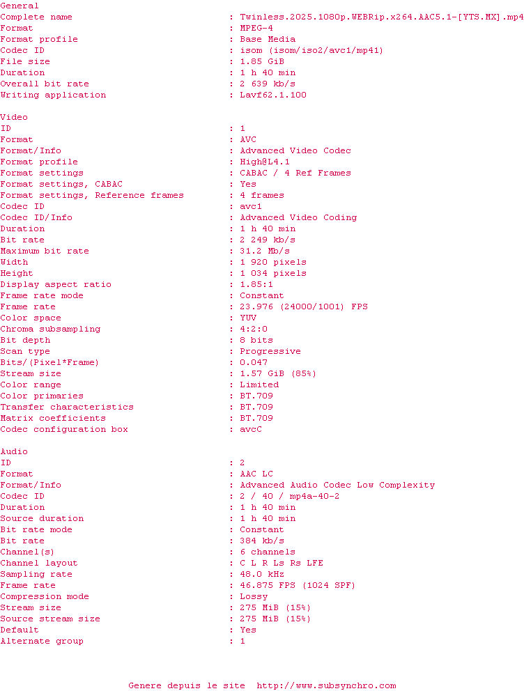 | Voir le nfo de la release Twinless.2025.1080p.WEBRip.x264.AAC5.1-YTS | YTS | Twinless.2025.1080p.WEBRip.x264.AAC5.1-YTS OpenSubtitles | 12/10/2025 | Disponible en Z2 | 1 fichier |