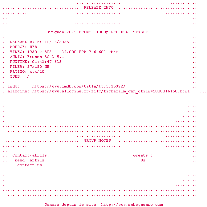 Telechargez le RSS « Fichier de la release Avignon.2025.FRENCH.1080p.WEB.H264-SEiGHT »