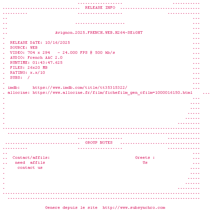 Telechargez le RSS « Fichier de la release Avignon.2025.FRENCH.WEB.H264-SEiGHT »
