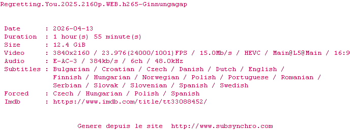 Y avez-vous pense ? Nous proposons déjà 1660 sous-titres pour le film Regretting You. Avez-vous essaye de voir si ces sous-titres etaient compatibles avec cette release ? On vous laisse le soin de tester cela pour nous et de contribuer au site en postant le sous-titre en cas de compatiblite constatee !