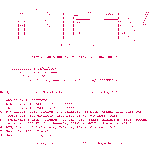 Telechargez le RSS « Fichier de la release Chien.51.2025.MULTi.COMPLETE.UHD.BLURAY-MMCLX »