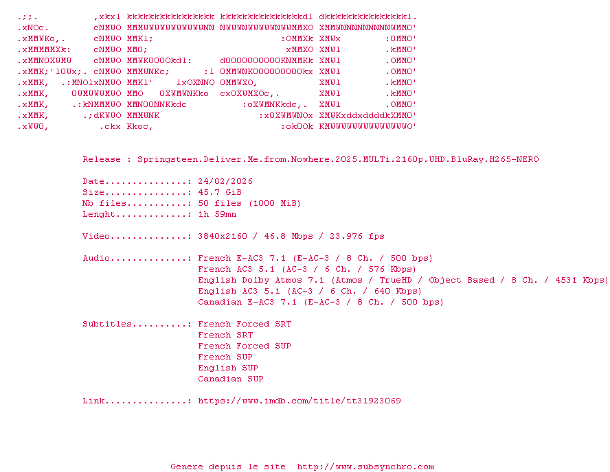 Y avez-vous pense ? Nous proposons déjà 1 sous-titre pour le film Springsteen: Deliver Me From Nowhere. Avez-vous essaye de voir si ces sous-titres etaient compatibles avec cette release ? On vous laisse le soin de tester cela pour nous et de contribuer au site en postant le sous-titre en cas de compatiblite constatee !