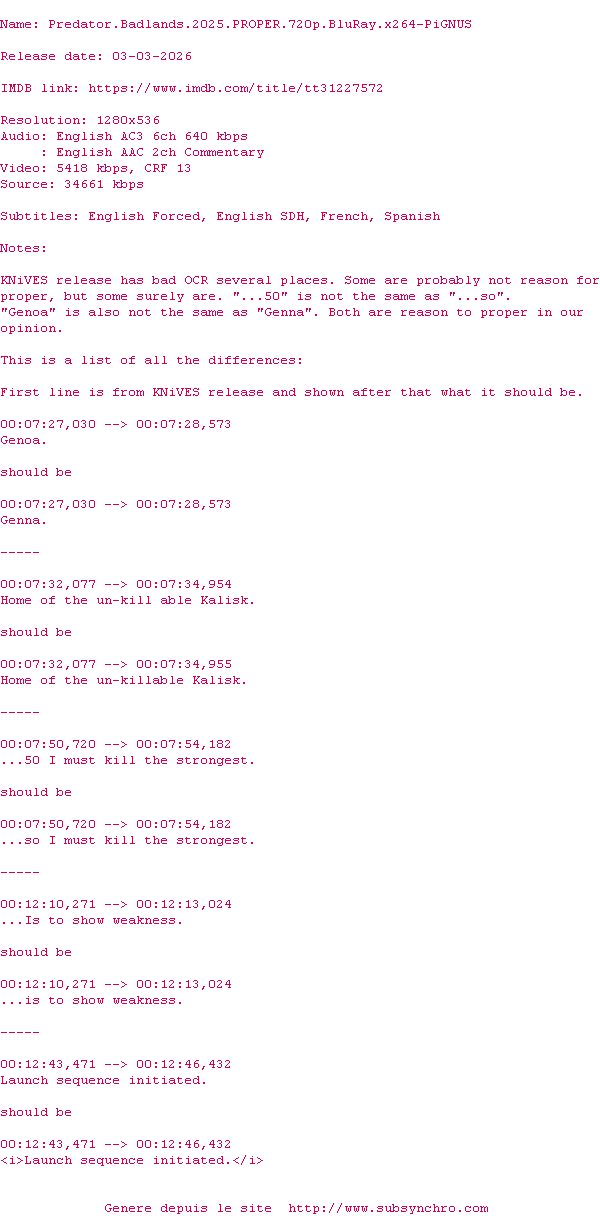 Y avez-vous pense ? Nous proposons déjà 2 sous-titres pour le film Predator: Badlands. Avez-vous essaye de voir si ces sous-titres etaient compatibles avec cette release ? On vous laisse le soin de tester cela pour nous et de contribuer au site en postant le sous-titre en cas de compatiblite constatee !