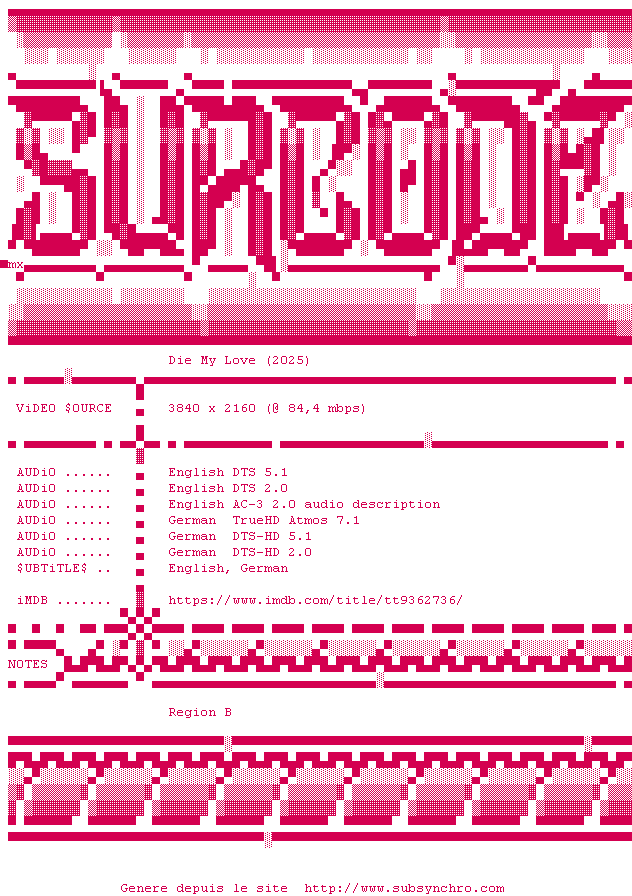 Y avez-vous pense ? Nous proposons déjà 1840 sous-titres pour le film Die My Love. Avez-vous essaye de voir si ces sous-titres etaient compatibles avec cette release ? On vous laisse le soin de tester cela pour nous et de contribuer au site en postant le sous-titre en cas de compatiblite constatee !