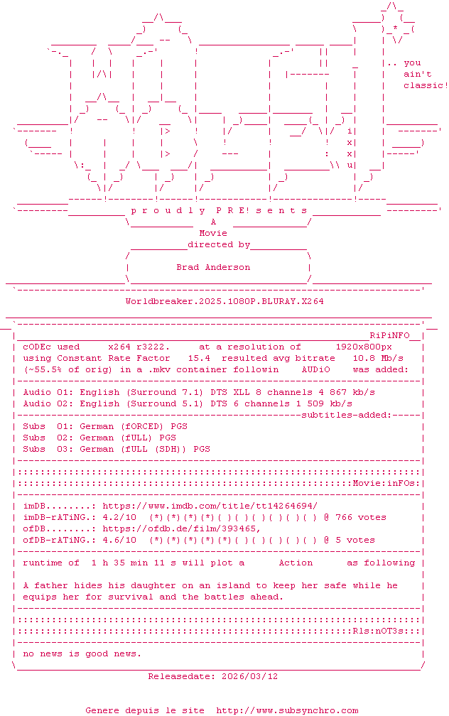 Telechargez le RSS « Fichier de la release Worldbreaker.2025.1080P.BLURAY.x264-WATCHABLE »