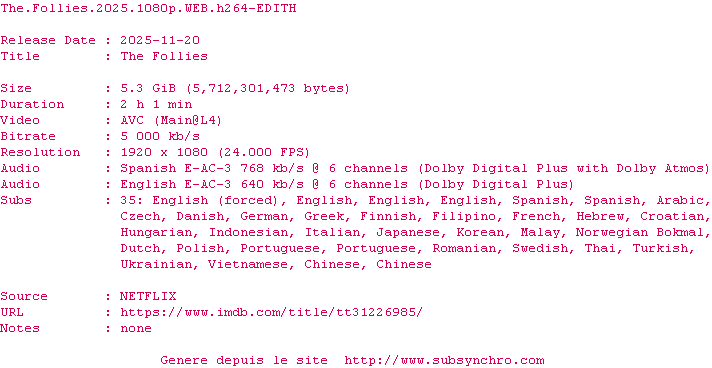 | Voir le nfo de la release The.Follies.2025.1080p.WEB.H264-EDITH | EDITH | The.Follies.2025.1080p.WEB.H264-EDITH OpenSubtitles | 0 fichier | ||