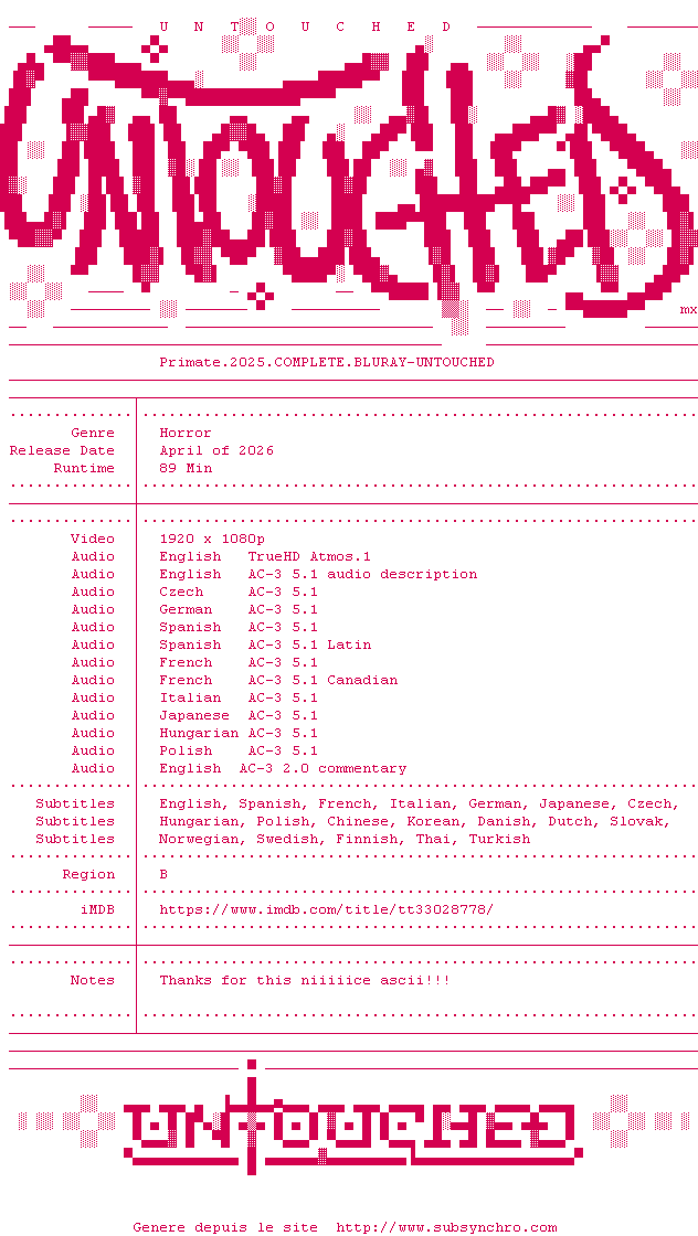 Y avez-vous pense ? Nous proposons déjà 1839 sous-titres pour le film Primate. Avez-vous essaye de voir si ces sous-titres etaient compatibles avec cette release ? On vous laisse le soin de tester cela pour nous et de contribuer au site en postant le sous-titre en cas de compatiblite constatee !