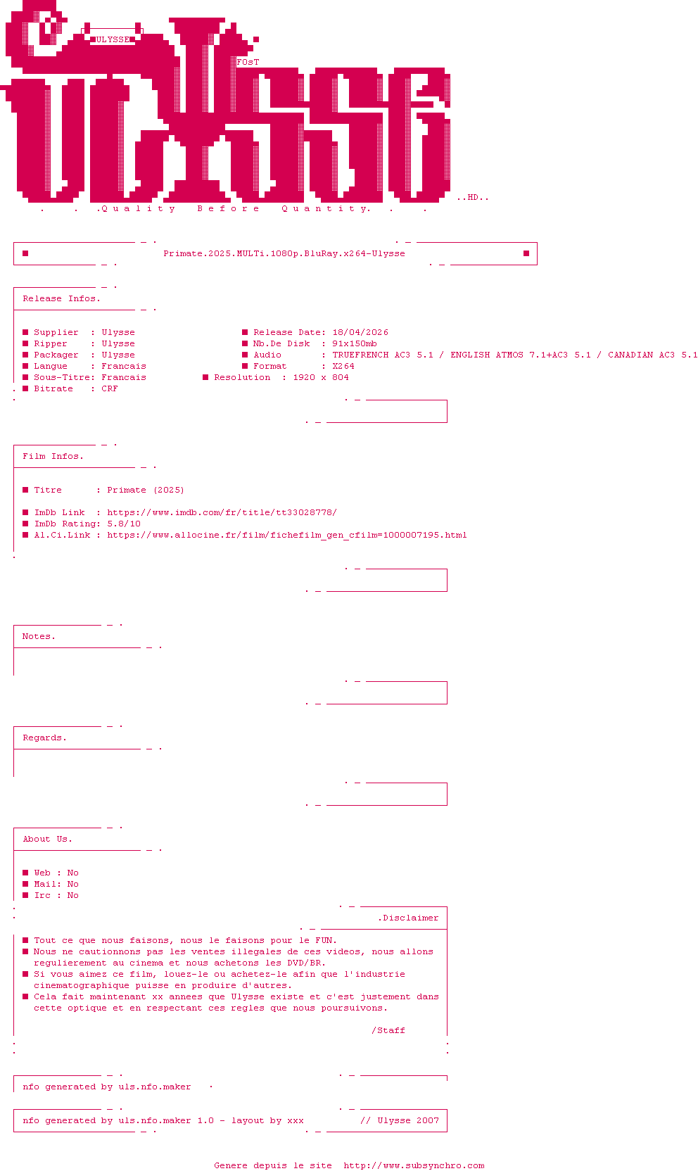 Y avez-vous pense ? Nous proposons déjà 1853 sous-titres pour le film Primate. Avez-vous essaye de voir si ces sous-titres etaient compatibles avec cette release ? On vous laisse le soin de tester cela pour nous et de contribuer au site en postant le sous-titre en cas de compatiblite constatee !