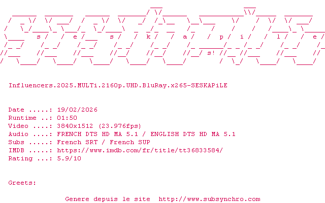 Telechargez le RSS « Fichier de la release Influencers.2025.MULTi.2160p.UHD.BluRay.x265-SESKAPiLE »