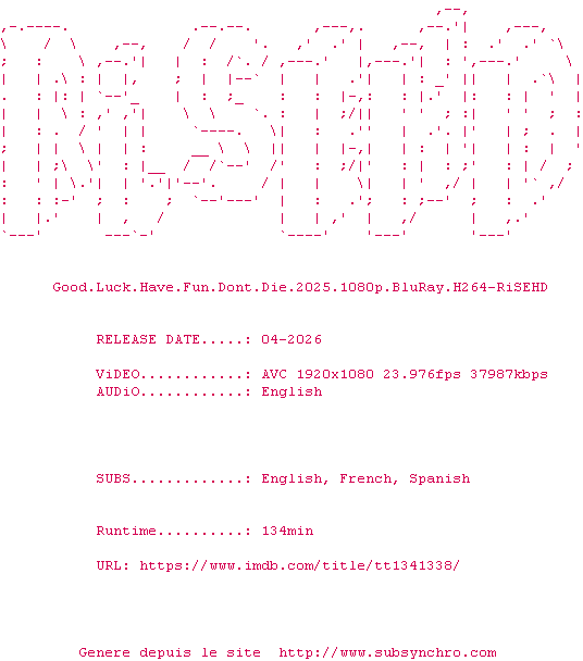 Y avez-vous pense ? Nous proposons déjà 1818 sous-titres pour le film Good Luck, Have Fun, Don't Die. Avez-vous essaye de voir si ces sous-titres etaient compatibles avec cette release ? On vous laisse le soin de tester cela pour nous et de contribuer au site en postant le sous-titre en cas de compatiblite constatee !
