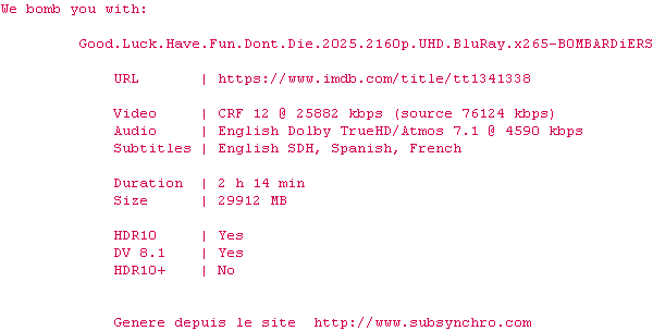 Y avez-vous pense ? Nous proposons déjà 2098 sous-titres pour le film Good Luck, Have Fun, Don't Die. Avez-vous essaye de voir si ces sous-titres etaient compatibles avec cette release ? On vous laisse le soin de tester cela pour nous et de contribuer au site en postant le sous-titre en cas de compatiblite constatee !