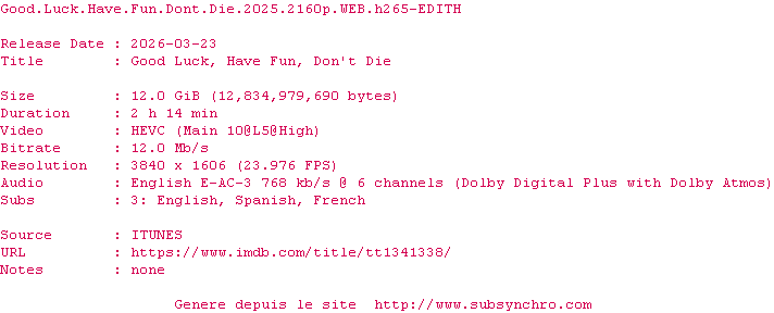 Y avez-vous pense ? Nous proposons déjà 2124 sous-titres pour le film Good Luck, Have Fun, Don't Die. Avez-vous essaye de voir si ces sous-titres etaient compatibles avec cette release ? On vous laisse le soin de tester cela pour nous et de contribuer au site en postant le sous-titre en cas de compatiblite constatee !