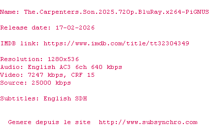 Telechargez le RSS « Fichier de la release The.Carpenters.Son.2025.720p.BluRay.x264-PiGNUS »