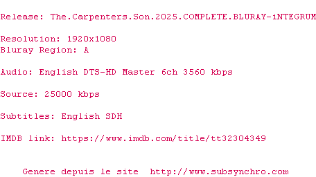 Telechargez le RSS « Fichier de la release The.Carpenters.Son.2025.COMPLETE.BLURAY-iNTEGRUM »