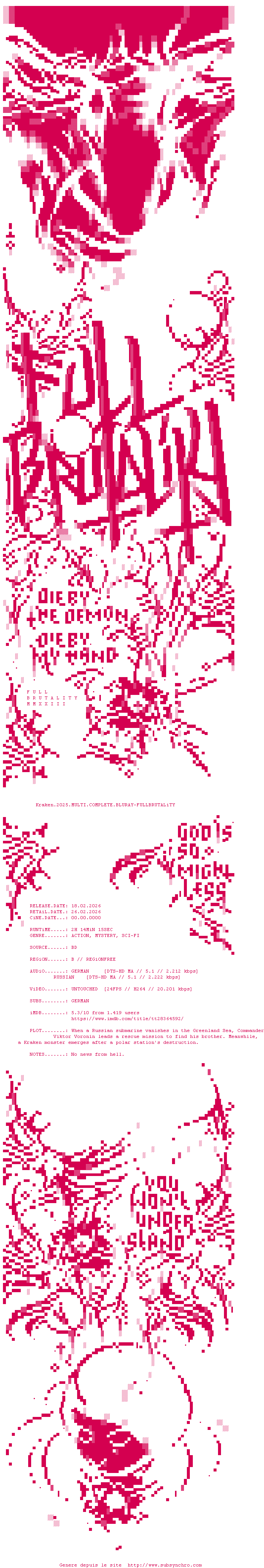 Telechargez le RSS « Fichier de la release Kraken.2025.MULTI.COMPLETE.BLURAY-FULLBRUTALiTY »