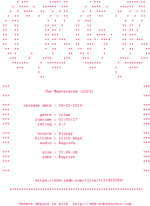 Telechargez le RSS « Fichier de la release The.Mastermind.2025.COMPLETE.BLURAY-CBGB »