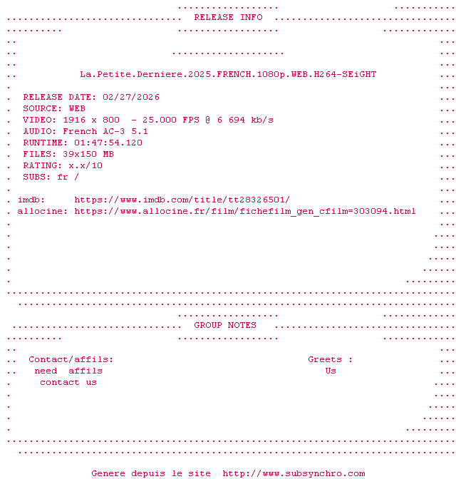 Y avez-vous pense ? Nous proposons déjà 1 sous-titre pour le film The LLittle Sister. Avez-vous essaye de voir si ces sous-titres etaient compatibles avec cette release ? On vous laisse le soin de tester cela pour nous et de contribuer au site en postant le sous-titre en cas de compatiblite constatee !