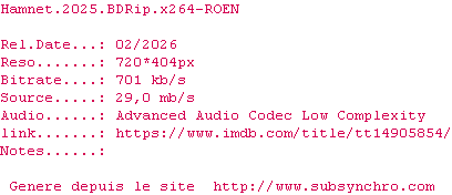 Y avez-vous pense ? Nous proposons déjà 1 sous-titre pour le film Hamnet. Avez-vous essaye de voir si ces sous-titres etaient compatibles avec cette release ? On vous laisse le soin de tester cela pour nous et de contribuer au site en postant le sous-titre en cas de compatiblite constatee !
