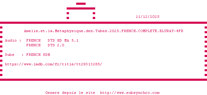 Telechargez le RSS « Fichier de la release Amelie.Et.La.Metaphysique.Des.Tubes.2025.FRENCH.COMPLETE.BLURAY-4FR »