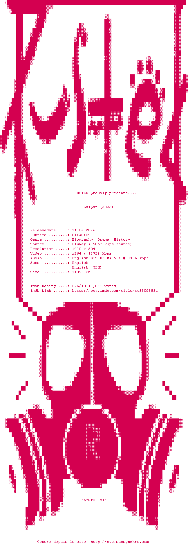 Y avez-vous pense ? Nous proposons déjà 1624 sous-titres pour le film Saipan. Avez-vous essaye de voir si ces sous-titres etaient compatibles avec cette release ? On vous laisse le soin de tester cela pour nous et de contribuer au site en postant le sous-titre en cas de compatiblite constatee !