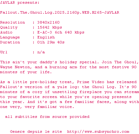 | HDSWEB | Fallout.The.Ghoul.Log.2025.1080p.AMZN.WEB-DL.DDP5.1.H.264-HDSWEB OpenSubtitles | 10/03/2026 | Disponible en Z2, Z1 | 2 fichiers | |