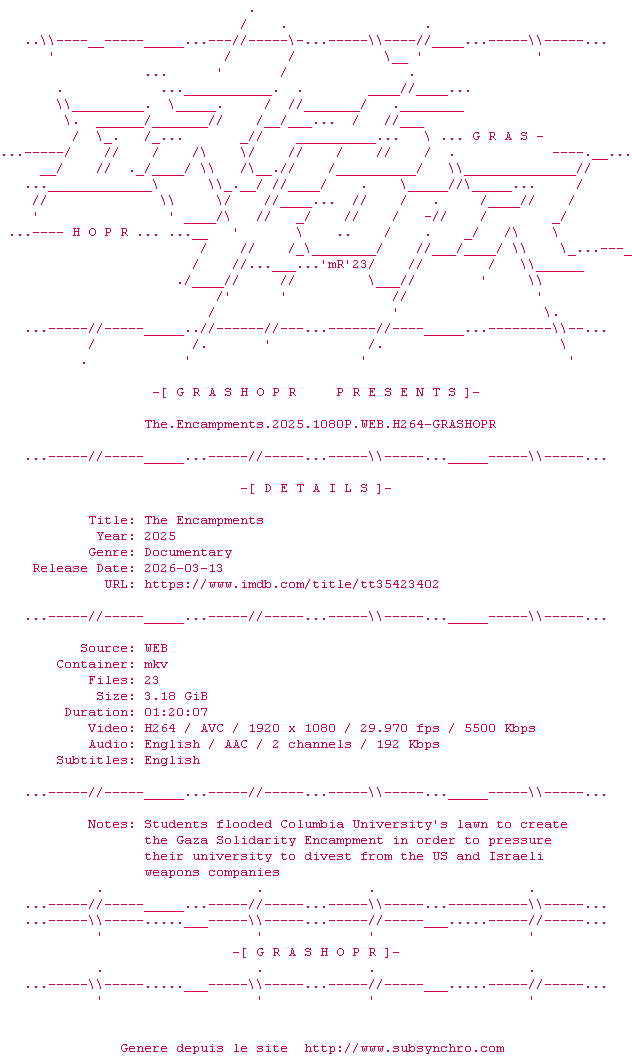 Telechargez le RSS « Fichier de la release The.Encampments.2025.1080P.WEB.H264-GRASHOPR »