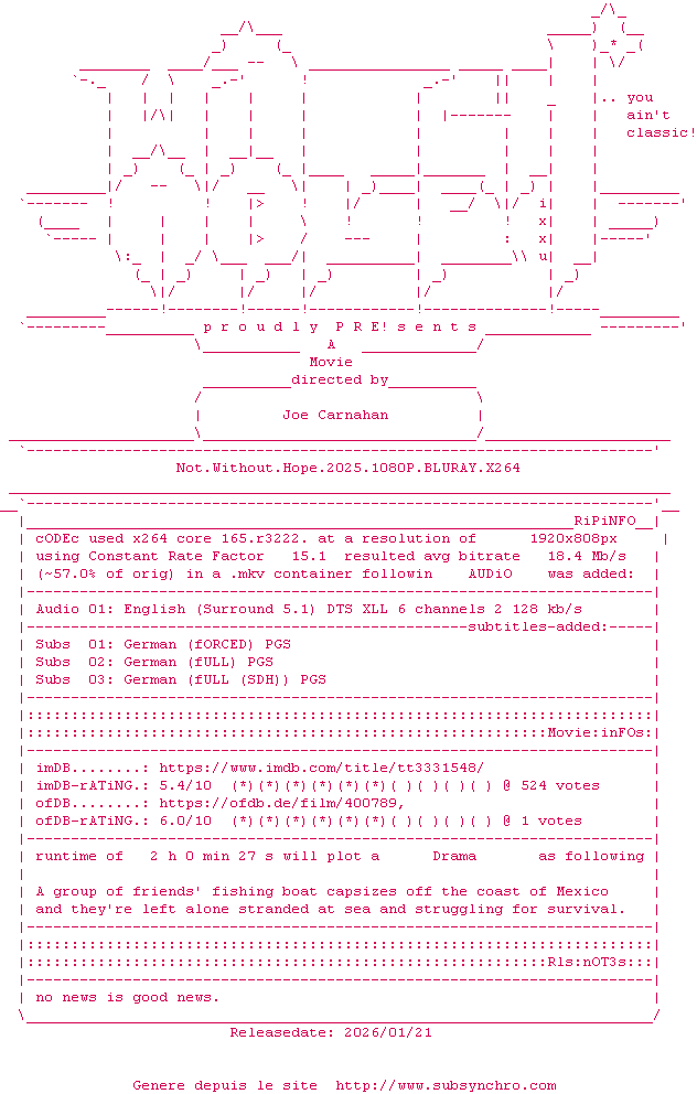 Telechargez le RSS « Fichier de la release Not.Without.Hope.2025.1080P.BLURAY.x264-WATCHABLE »