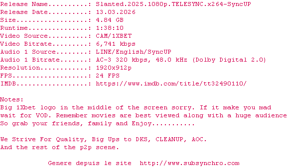 Telechargez le RSS « Fichier de la release Slanted.2025.1080p.TELESYNC.x264-SyncUP »