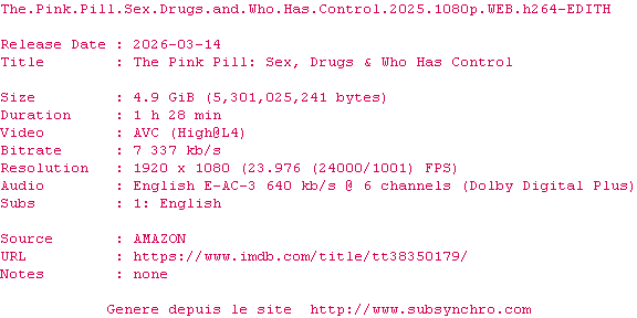 Telechargez le RSS « Fichier de la release The.Pink.Pill.Sex.Drugs.And.Who.Has.Control.2025.1080p.WEB.H264-EDITH »