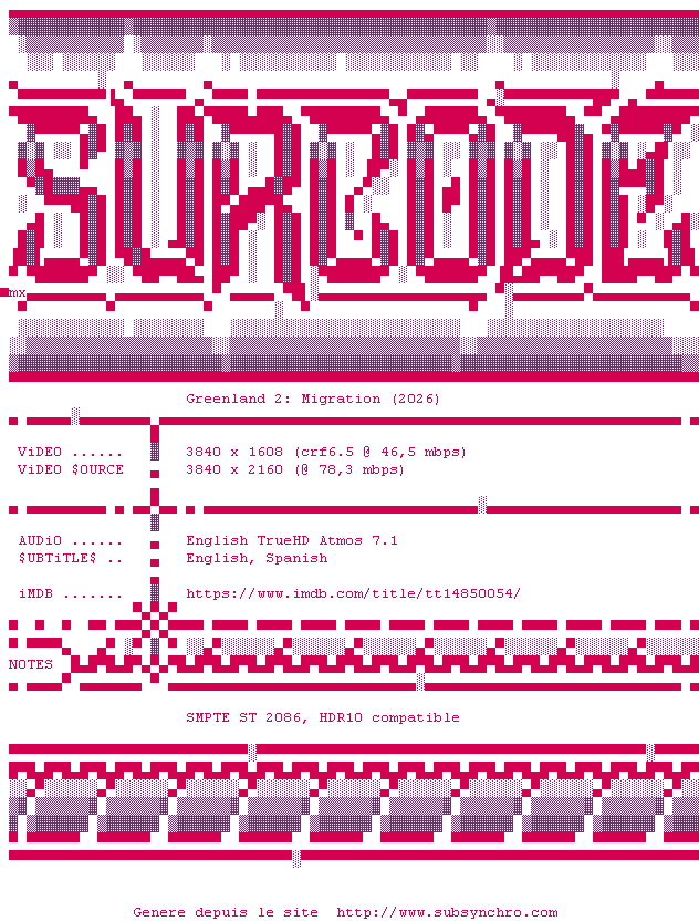 Y avez-vous pense ? Nous proposons déjà 1173 sous-titres pour le film Greenland Migration. Avez-vous essaye de voir si ces sous-titres etaient compatibles avec cette release ? On vous laisse le soin de tester cela pour nous et de contribuer au site en postant le sous-titre en cas de compatiblite constatee !