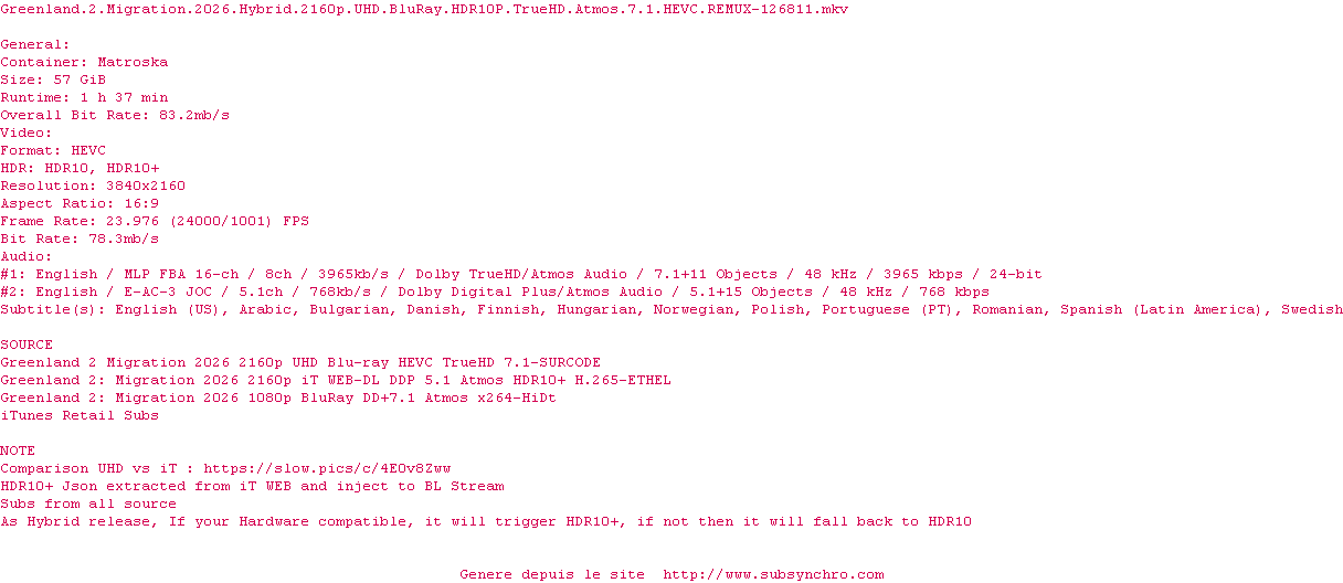 La release Greenland.2.Migration.2026.Hybrid.2160p.UHD.BluRay.HDR10P.TrueHD.Atmos.7.1.HEVC.REMUX-126811 est en 4K