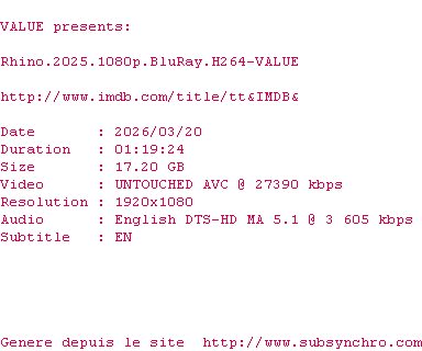 | Voir le nfo de la release Rhino.2025.1080p.BluRay.H264-VALUE | VALUE | Rhino.2025.1080p.BluRay.H264-VALUE OpenSubtitles | 0 fichier |
