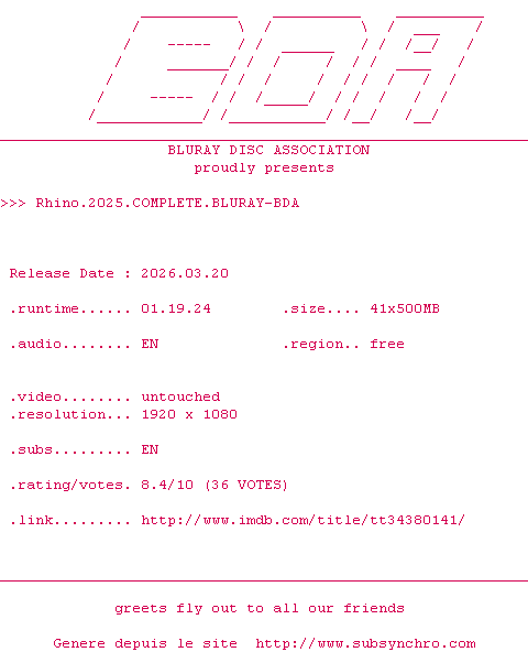 | Voir le nfo de la release Rhino.2025.COMPLETE.BLURAY-BDA | BDA | Rhino.2025.COMPLETE.BLURAY-BDA OpenSubtitles | 0 fichier | ||