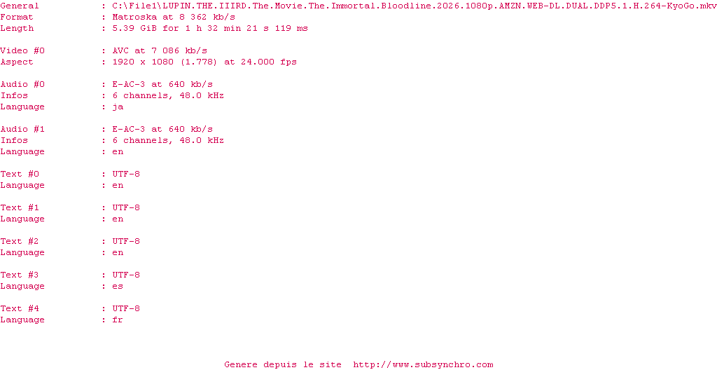 Y avez-vous pense ? Nous proposons déjà 1329 sous-titres pour le film Lupin the IIIrd the Movie: la lignée immortelle / Lupin the IIIrd the Movie: The Immortal Bloodline. Avez-vous essaye de voir si ces sous-titres etaient compatibles avec cette release ? On vous laisse le soin de tester cela pour nous et de contribuer au site en postant le sous-titre en cas de compatiblite constatee !