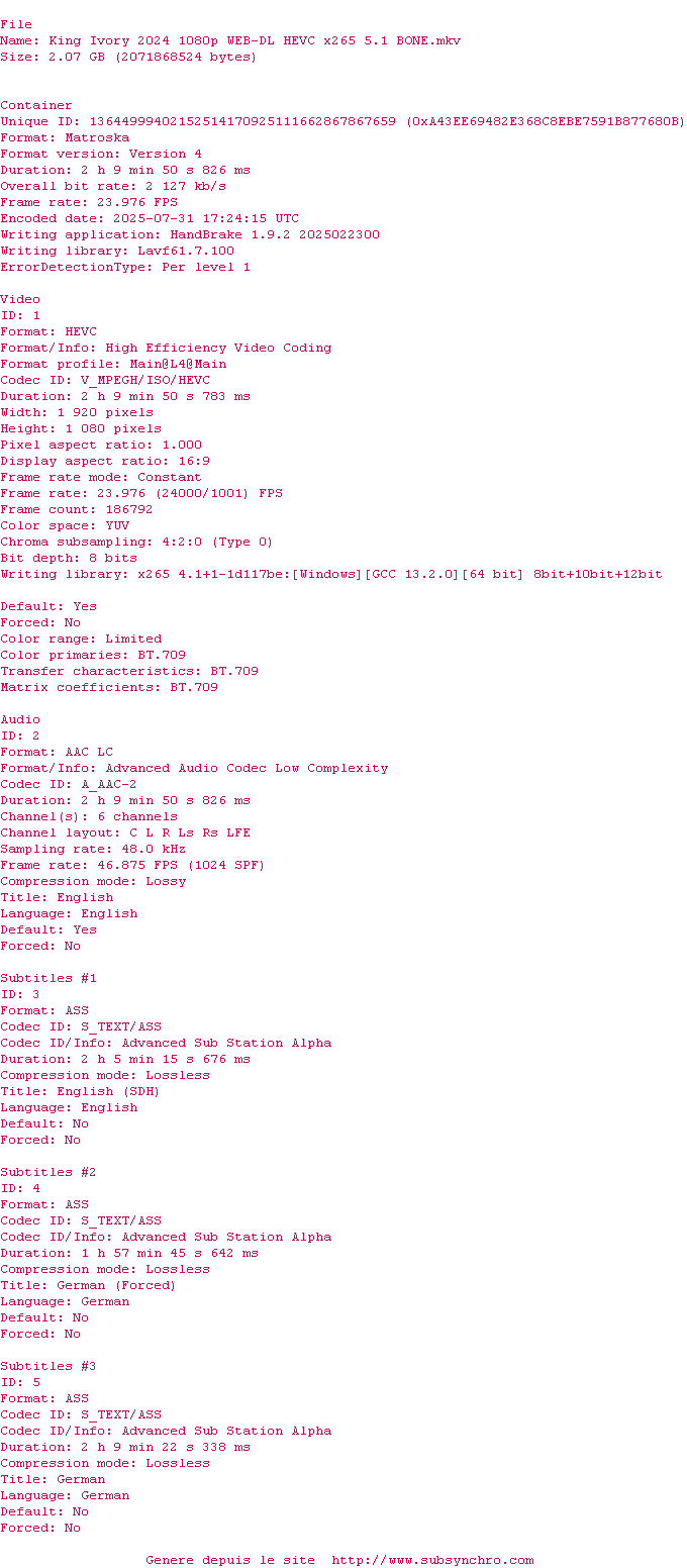 | Voir le nfo de la release King.Ivory.2024.1080p.WEB-DL.HEVC.x265.5.1-BONE | BONE | King.Ivory.2024.1080p.WEB-DL.HEVC.x265.5.1-BONE OpenSubtitles | 26/03/2026 | Disponible en Z2 | 1 fichier |