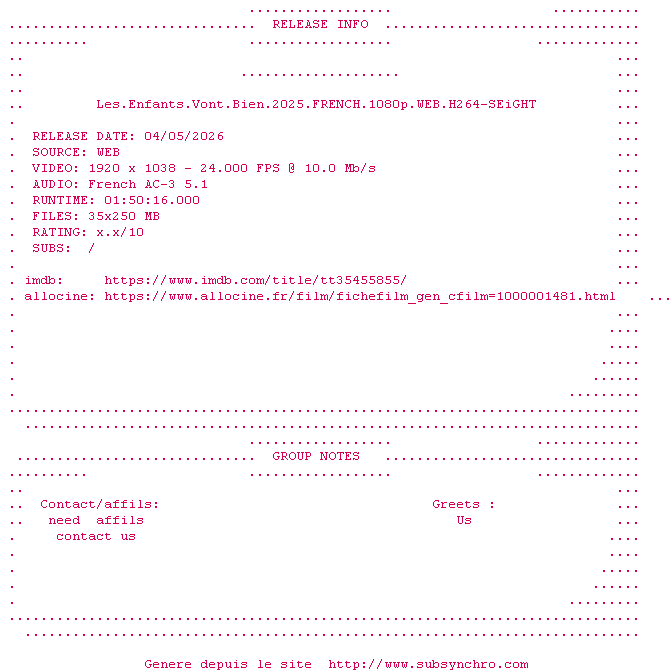Y avez-vous pense ? Nous proposons déjà 1631 sous-titres pour le film Les Enfants vont bien. Avez-vous essaye de voir si ces sous-titres etaient compatibles avec cette release ? On vous laisse le soin de tester cela pour nous et de contribuer au site en postant le sous-titre en cas de compatiblite constatee !