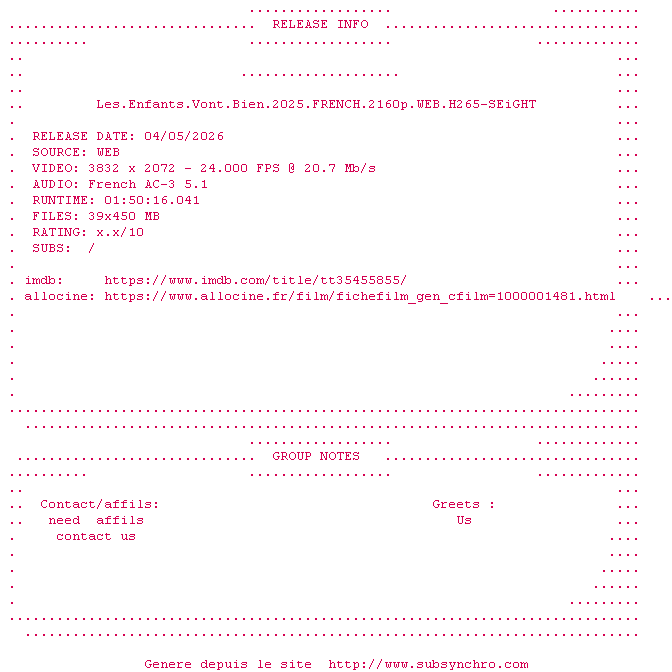 Y avez-vous pense ? Nous proposons déjà 1631 sous-titres pour le film Les Enfants vont bien. Avez-vous essaye de voir si ces sous-titres etaient compatibles avec cette release ? On vous laisse le soin de tester cela pour nous et de contribuer au site en postant le sous-titre en cas de compatiblite constatee !