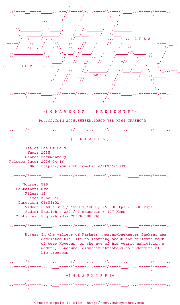 Y avez-vous pense ? Nous proposons déjà 1783 sous-titres pour le film Pot of Gold. Avez-vous essaye de voir si ces sous-titres etaient compatibles avec cette release ? On vous laisse le soin de tester cela pour nous et de contribuer au site en postant le sous-titre en cas de compatiblite constatee !