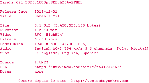 Y avez-vous pense ? Nous proposons déjà 1800 sous-titres pour le film Sarah’s Oil. Avez-vous essaye de voir si ces sous-titres etaient compatibles avec cette release ? On vous laisse le soin de tester cela pour nous et de contribuer au site en postant le sous-titre en cas de compatiblite constatee !