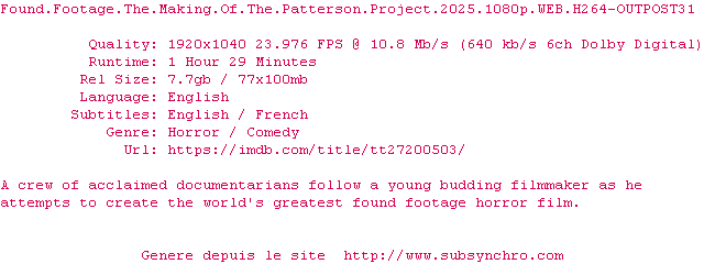 Y avez-vous pense ? Nous proposons déjà 1863 sous-titres pour le film Found Footage: The Making of the Patterson Project. Avez-vous essaye de voir si ces sous-titres etaient compatibles avec cette release ? On vous laisse le soin de tester cela pour nous et de contribuer au site en postant le sous-titre en cas de compatiblite constatee !