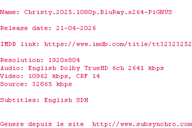 Y avez-vous pense ? Nous proposons déjà 1939 sous-titres pour le film Christy. Avez-vous essaye de voir si ces sous-titres etaient compatibles avec cette release ? On vous laisse le soin de tester cela pour nous et de contribuer au site en postant le sous-titre en cas de compatiblite constatee !