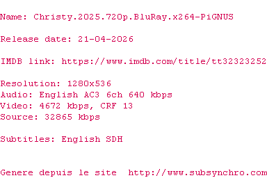 Y avez-vous pense ? Nous proposons déjà 1939 sous-titres pour le film Christy. Avez-vous essaye de voir si ces sous-titres etaient compatibles avec cette release ? On vous laisse le soin de tester cela pour nous et de contribuer au site en postant le sous-titre en cas de compatiblite constatee !