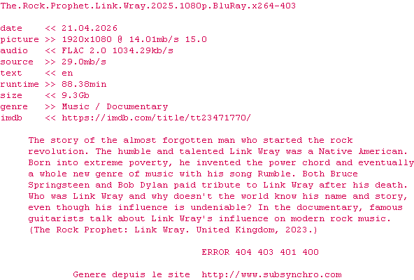 Y avez-vous pense ? Nous proposons déjà 1939 sous-titres pour le film The Rock Prophet: Link Wray. Avez-vous essaye de voir si ces sous-titres etaient compatibles avec cette release ? On vous laisse le soin de tester cela pour nous et de contribuer au site en postant le sous-titre en cas de compatiblite constatee !