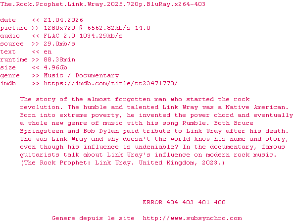 Y avez-vous pense ? Nous proposons déjà 1939 sous-titres pour le film The Rock Prophet: Link Wray. Avez-vous essaye de voir si ces sous-titres etaient compatibles avec cette release ? On vous laisse le soin de tester cela pour nous et de contribuer au site en postant le sous-titre en cas de compatiblite constatee !