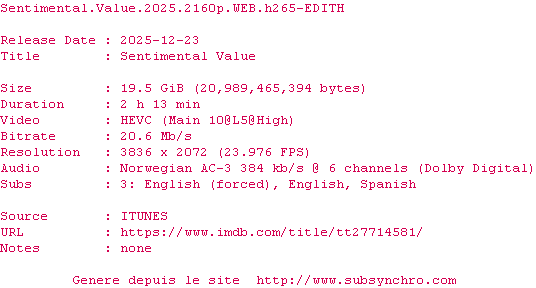 Y avez-vous pense ? Nous proposons déjà 2080 sous-titres pour le film Valeur sentimentale / Sentimental Value. Avez-vous essaye de voir si ces sous-titres etaient compatibles avec cette release ? On vous laisse le soin de tester cela pour nous et de contribuer au site en postant le sous-titre en cas de compatiblite constatee !