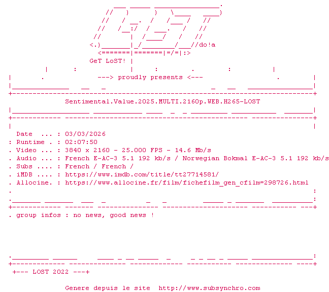 Y avez-vous pense ? Nous proposons déjà 2080 sous-titres pour le film Valeur sentimentale / Sentimental Value. Avez-vous essaye de voir si ces sous-titres etaient compatibles avec cette release ? On vous laisse le soin de tester cela pour nous et de contribuer au site en postant le sous-titre en cas de compatiblite constatee !