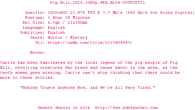 Y avez-vous pense ? Nous proposons déjà 2124 sous-titres pour le film Pig Hill. Avez-vous essaye de voir si ces sous-titres etaient compatibles avec cette release ? On vous laisse le soin de tester cela pour nous et de contribuer au site en postant le sous-titre en cas de compatiblite constatee !