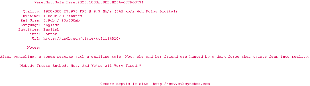 Y avez-vous pense ? Nous proposons déjà 2124 sous-titres pour le film We're Not Safe Here. Avez-vous essaye de voir si ces sous-titres etaient compatibles avec cette release ? On vous laisse le soin de tester cela pour nous et de contribuer au site en postant le sous-titre en cas de compatiblite constatee !